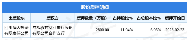 海天股份(603759)2月25日公开信息显示,股东四川海天投资有限责任公司向成都农村商业银行股份有限公司合作支行合计质押2800.0万股,占总股本6.06%。质押详情见下表: