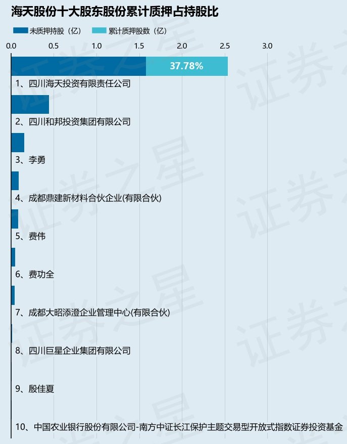 截止本公告日,股东四川海天投资有限责任公司已累计质押股份9578.0万股,占其持股总数的37.78%。本次质押后海天股份十大股东的累计质押股份占持股比例见下图: